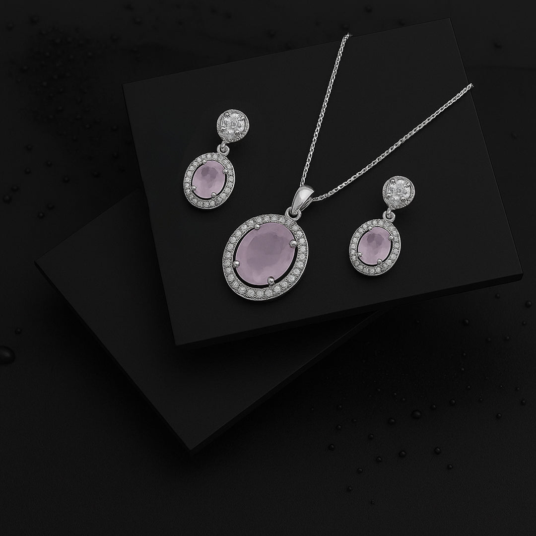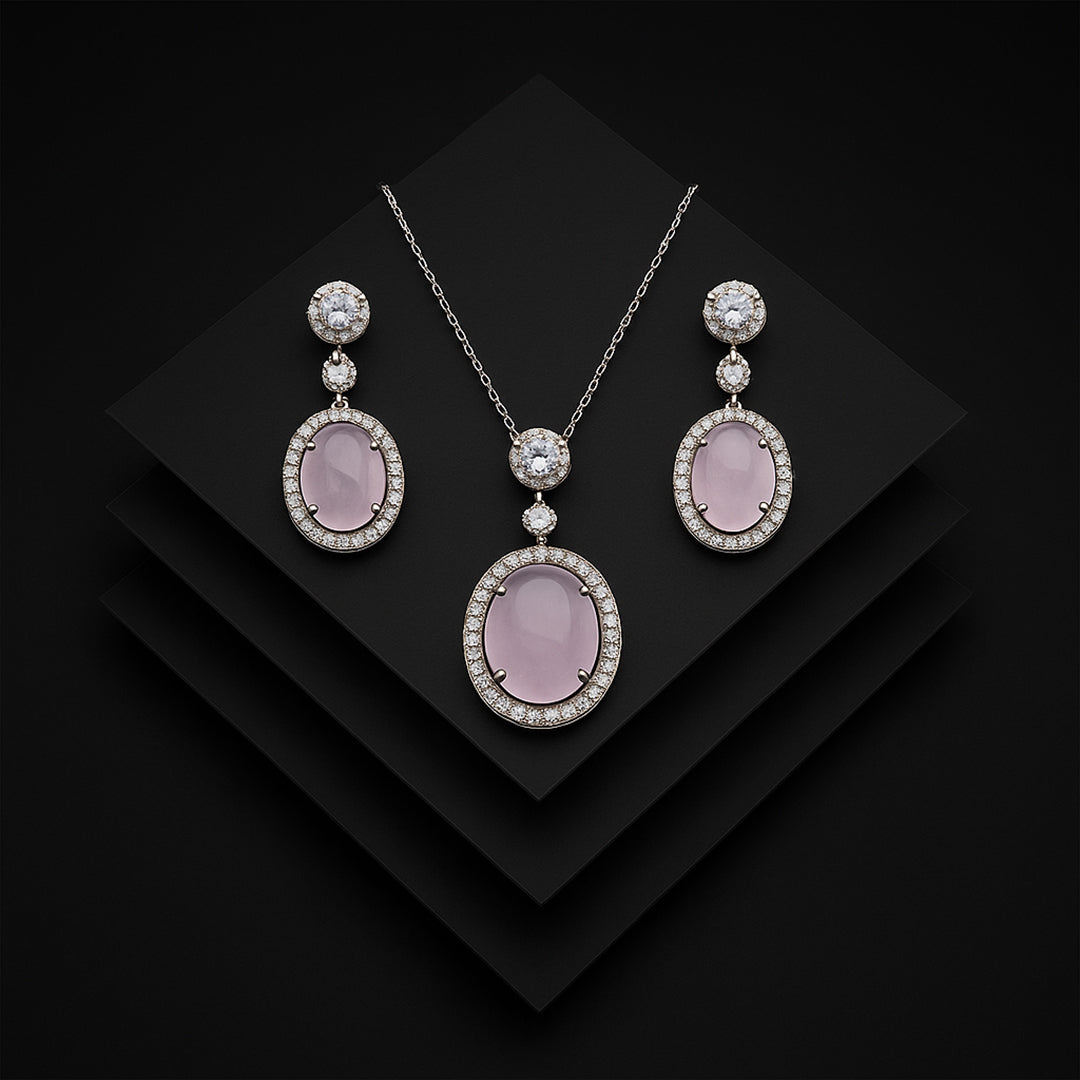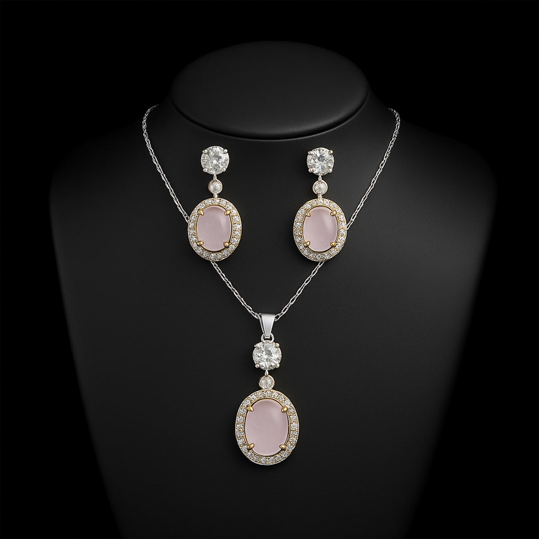 Elevate your elegance with the Blush Radiance Diamond Set — a captivating blend of soft rose quartz and brilliant-cut diamonds. This exquisite set includes a delicately crafted pendant and matching earrings, each featuring a blush pink centerpiece encircled by a halo of shimmering diamonds. Perfect for weddings, soirées, or adding a luxurious touch to any outfit. Refined beauty meets timeless charm.