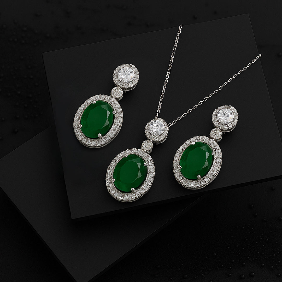 Turn heads with the regal charm of the Emerald Elegance Halo Set. This stunning trio features vibrant green gemstones encased in halos of brilliant-cut diamonds, radiating sophistication and grace. The matching pendant and earrings are designed in a classic oval silhouette, perfect for formal occasions or adding a luxurious touch to any ensemble. A timeless treasure for the modern queen.