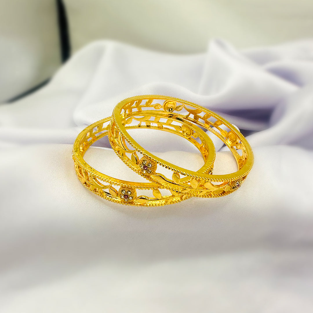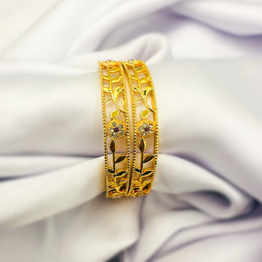 Celebrate delicate beauty with our Floral Bloom Cutwork Bangles. Designed with open-style artistry, these bangles showcase intricate leafy vines and dainty floral motifs accented with shimmering stones. The gold finish enhances their charm, making them a perfect blend of elegance and craftsmanship. Ideal for festive occasions or graceful everyday wear.