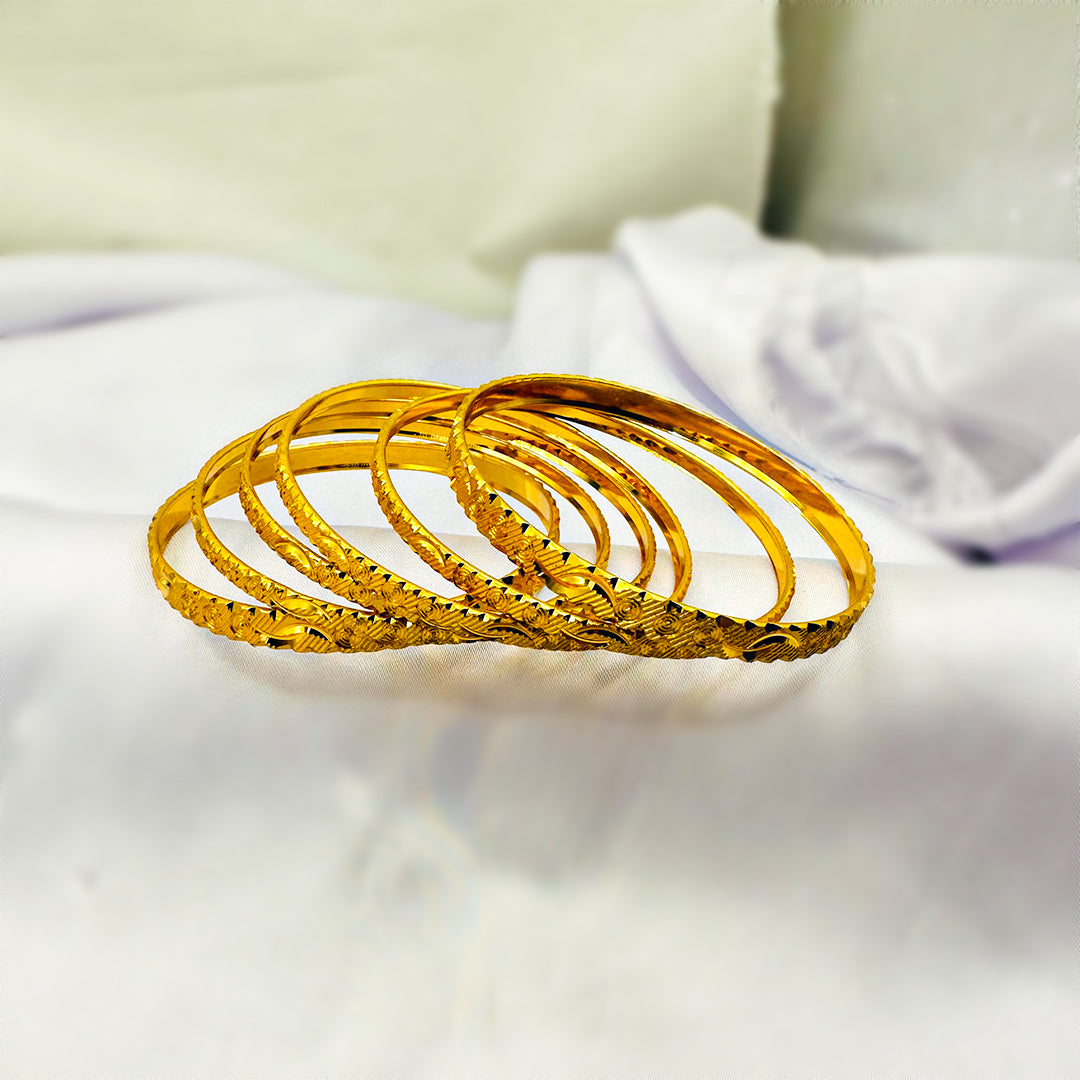 This exquisite set of gold bangles showcases a rich, detailed carved pattern that reflects timeless artistry and elegance. Designed with fine craftsmanship, each bangle radiates a luxurious shine, making it perfect for weddings, festive occasions, or as a statement piece for everyday wear. The intricate motifs add depth and texture, symbolizing tradition with a modern touch.