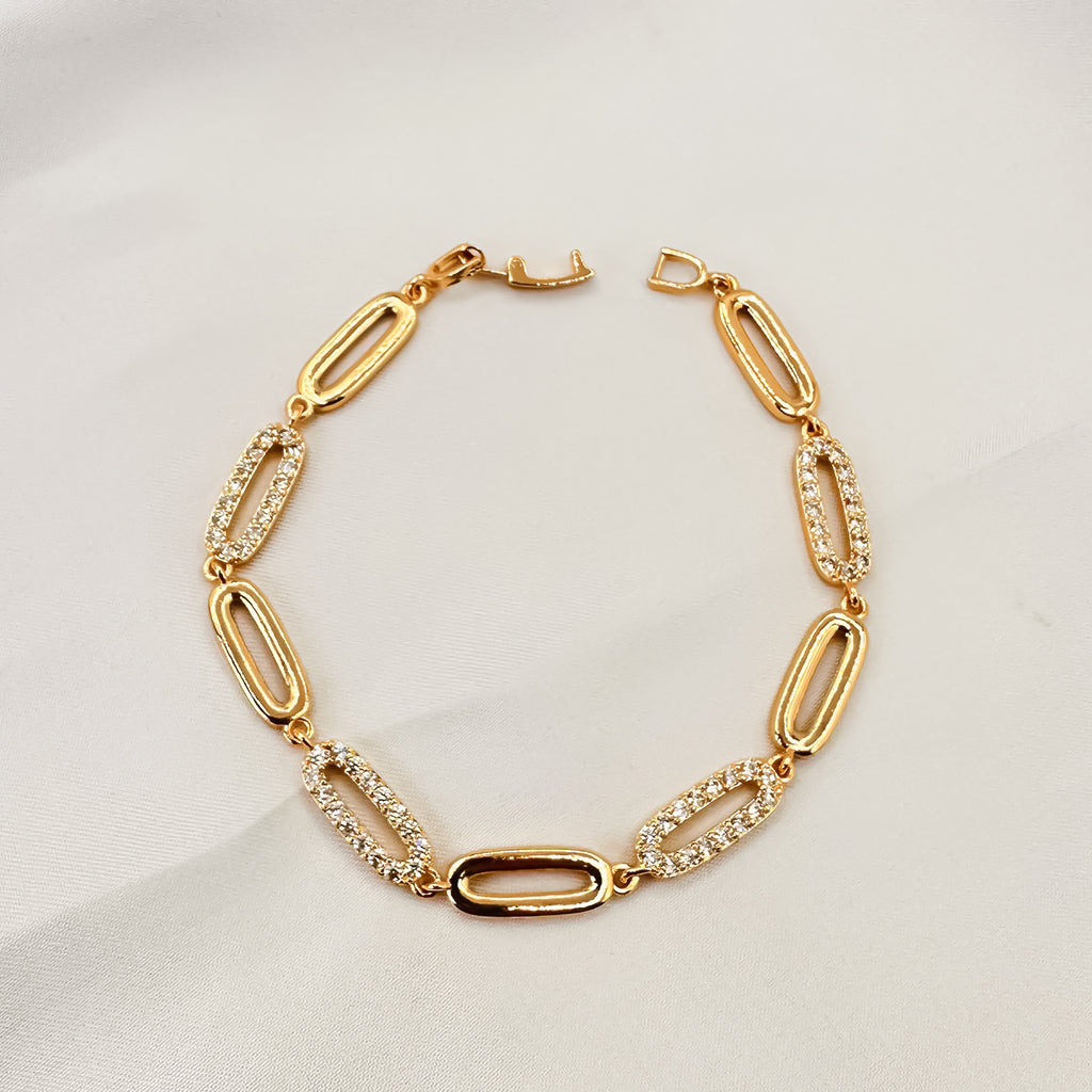 This sophisticated bracelet showcases a stylish design of alternating open oval links in high-polish yellow gold and sparkling pavé-set stones. The sleek, elongated oval shapes offer a modern twist on classic elegance, making it an ideal accessory for upscale events or everyday luxury. With a secure clasp and lightweight feel, this bracelet combines glamour and comfort seamlessly. Perfect as a gift or statement piece, it adds a refined touch to any jewelry collection.