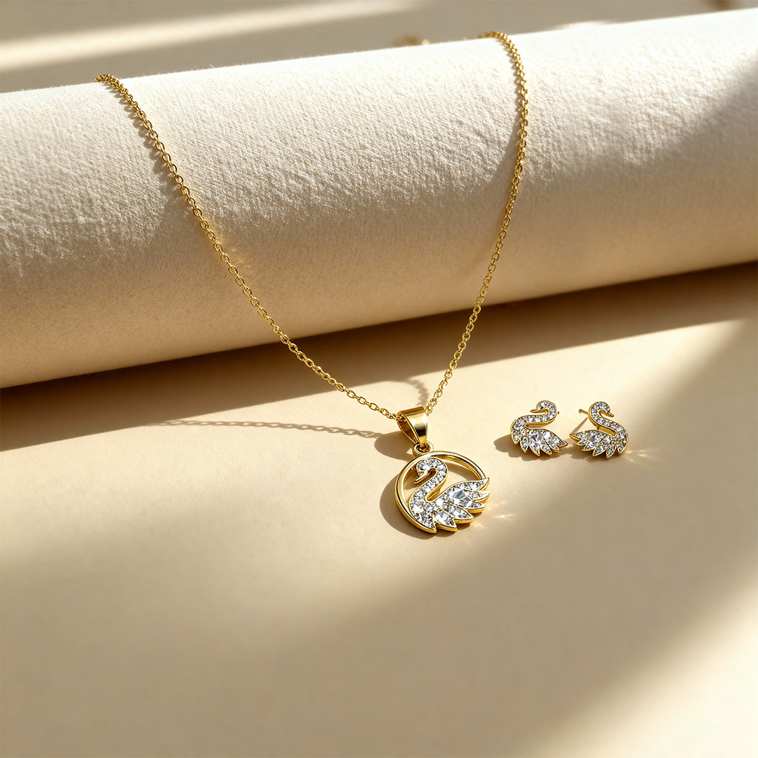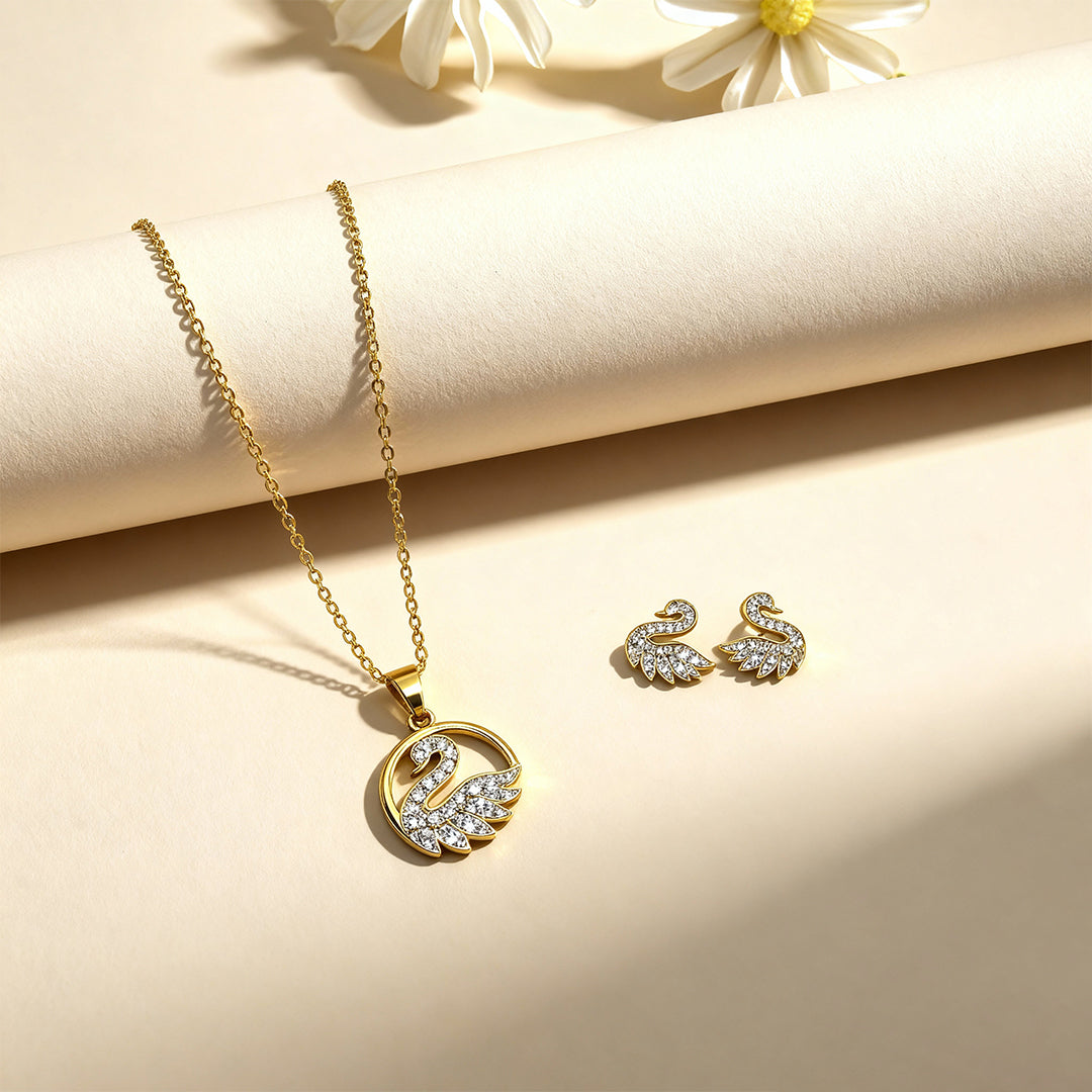 Inspired by the elegance of swans, this exquisite jewelry set features a stunning gold pendant and matching earrings adorned with shimmering crystals. The graceful swan design symbolizes beauty and purity, making it a timeless addition to any jewelry collection. Perfect for evening occasions or formal wear, this set adds a touch of luxury and refinement to your look. A true statement of sophistication and charm.