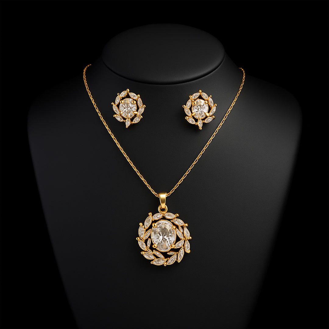 Elevate your jewelry collection with our Royal Bloom Gold Necklace & Earrings Set — a stunning fusion of timeless elegance and intricate craftsmanship. Featuring a radiant centerpiece surrounded by delicate marquise-cut stones, this set is perfect for weddings, formal events, or adding a touch of luxury to your everyday style. Crafted in fine gold plating with shimmering cubic zirconia, it's a masterpiece designed to make you shine.