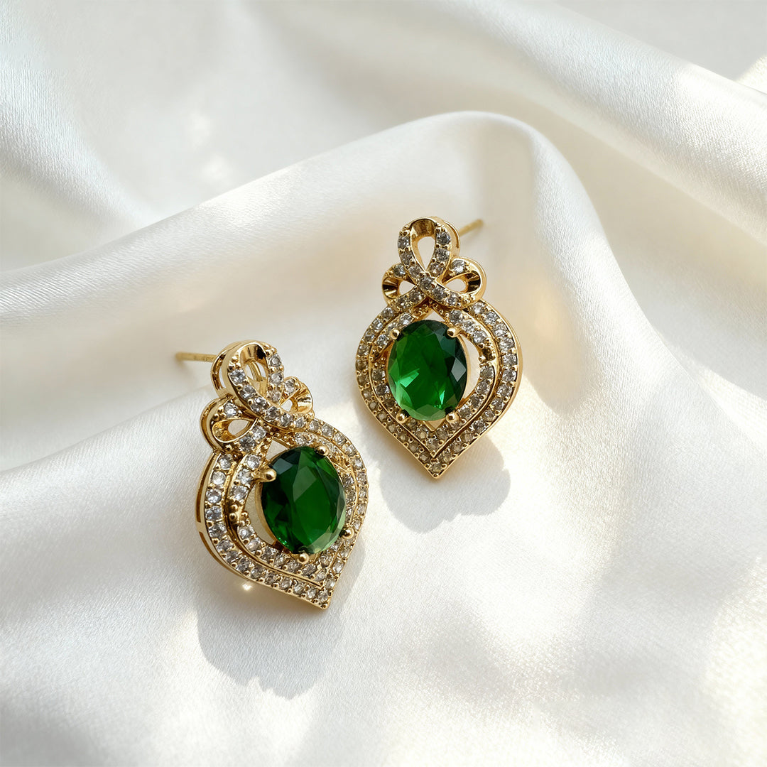 These exquisite Royal Green earrings feature a captivating emerald-green stone framed by intricate crystal detailing. The elegant teardrop shape and shimmering finish exude a royal charm, perfect for elevating both traditional and modern looks. Ideal for weddings, festive events, or evening wear, these earrings bring a bold yet graceful sparkle to any outfit. A timeless statement of luxury and sophistication.