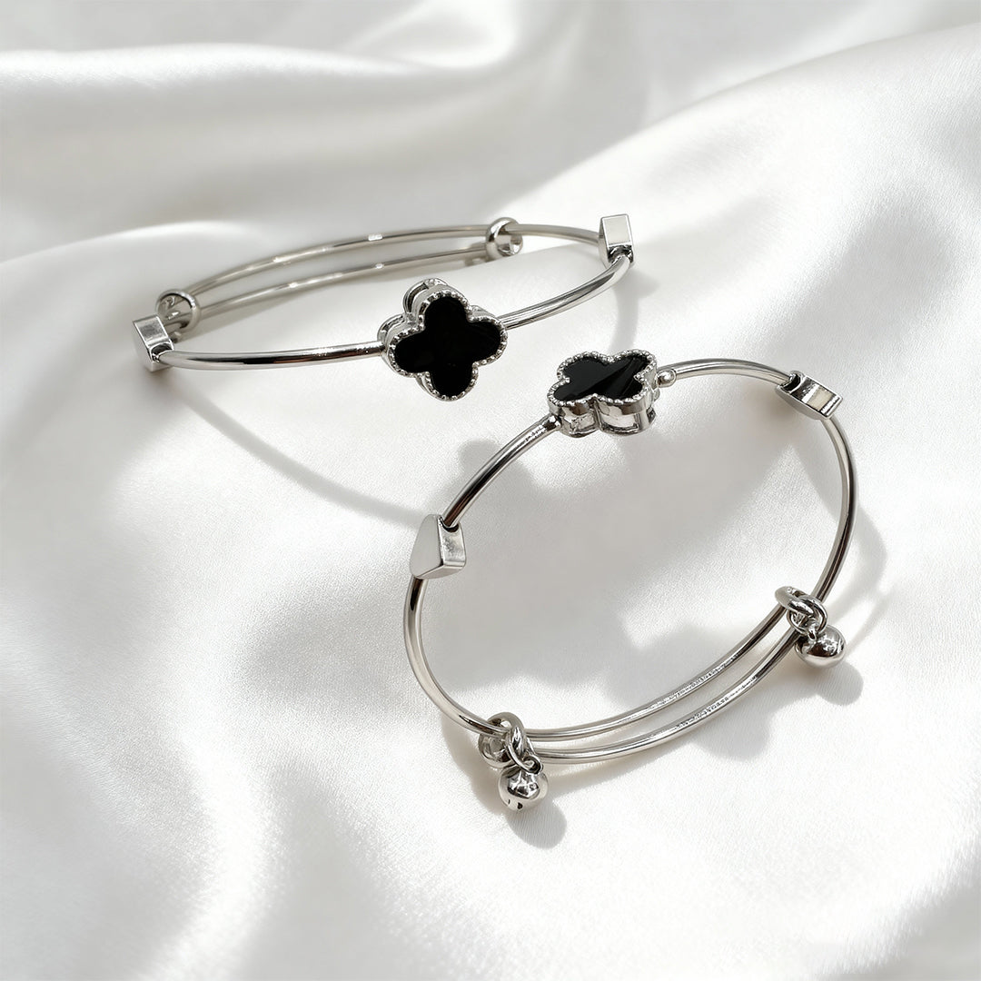 Crafted with a sleek silver finish, this bangle features black clover and heart charms that exude understated sophistication. The combination of silver shine and deep enamel tones adds a touch of modern elegance to your style. Perfect for both casual outings and evening occasions, this bracelet offers a refined balance of charm and grace. A timeless piece that complements any look with effortless allure.