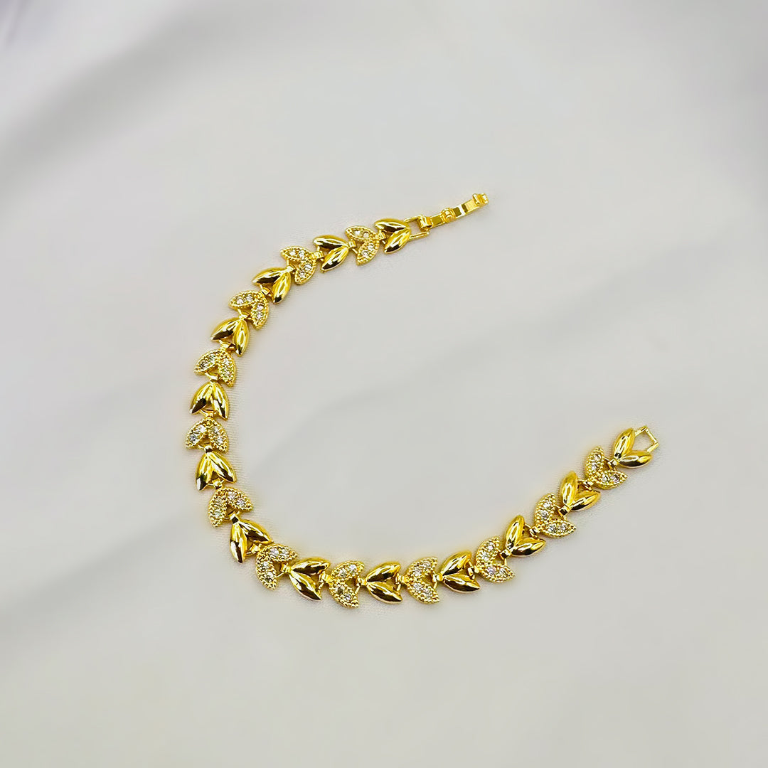 Inspired by nature's elegance, this bracelet features a graceful pattern of alternating gold and stone-studded leaf motifs. Crafted in brilliant yellow gold, each link resembles a delicate leaf, with shimmering stones that catch the light beautifully. The intricate design flows smoothly around the wrist, offering a blend of organic charm and refined luxury. Ideal for special occasions or everyday sophistication, this piece is secured with a durable clasp for a comfortable and secure fit. A timeless accessory for the modern woman.